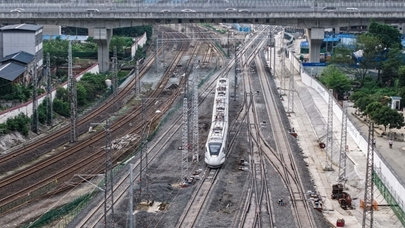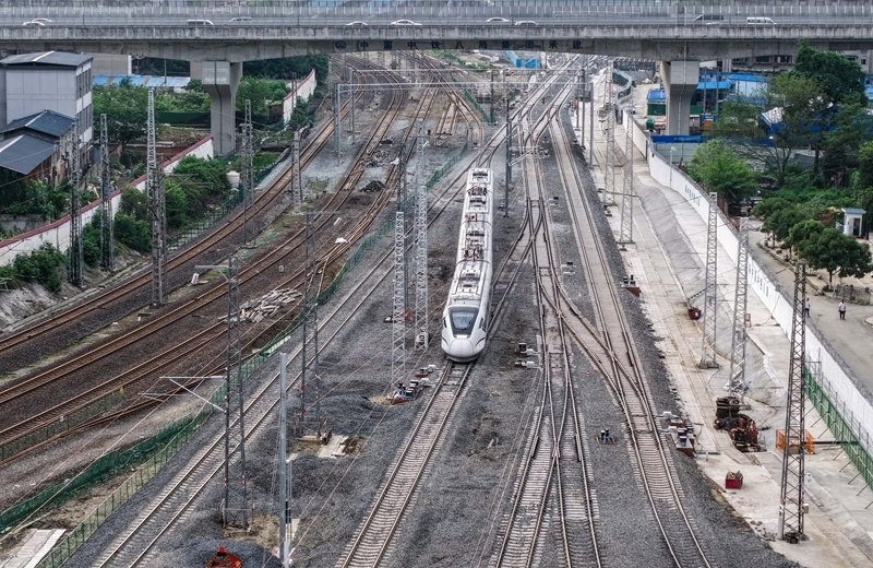 6月20日,成渝中线高铁成都站南北站场交替施工完成后,一列列车顺利通过成都站南站场(无人机拍摄)。 记者从中国铁路成都局集团有限公司成都建设指挥部获悉,6月20日6时,经近2000名作业人员520分钟的连续奋战,成渝中线高铁成都站南北站场交替施工圆满完成,标志着成渝中线高铁成都站改建工程整体过半,为项目按期开通奠定了坚实基础。这次交替施工是铁路营业线Ⅰ级施工,由中铁八局、中铁电气化局、成都工务段、成都电务段、成都供电段等10余家单位相互配合完成。 成都站位于四川省成都市,是新中国第一条自主建设的铁路——成渝铁路的起始站。为满足成渝中线高铁建设、市域铁路公交化改造建设等需要,车站进行了拆除扩建。车站建设采取“分步施工、南北交替”方案,将施工区域划分为南北两个作业面,实现了铁路正常运输与工程建设同步推进,完成衔接成渝、达成、宝成等多条铁路线路的拨接与改造。 新华社记者 江宏景 摄