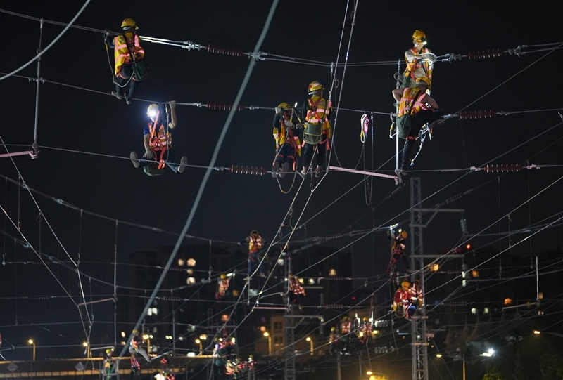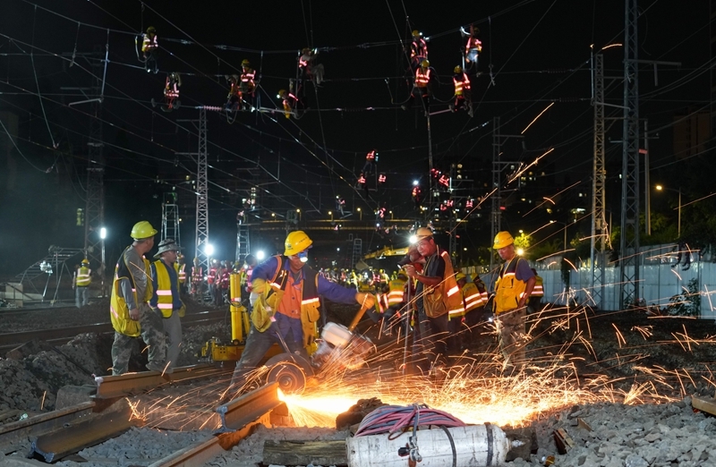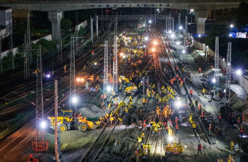 6月19日,在成渝中线高铁成都站南北站场交替施工现场,中铁八局施工人员在拆除原来的轨道和枕木,上方中国中铁电气化局的施工人员在进行接触网施工作业。 记者从中国铁路成都局集团有限公司成都建设指挥部获悉,6月20日6时,经近2000名作业人员520分钟的连续奋战,成渝中线高铁成都站南北站场交替施工圆满完成,标志着成渝中线高铁成都站改建工程整体过半,为项目按期开通奠定了坚实基础。这次交替施工是铁路营业线Ⅰ级施工,由中铁八局、中铁电气化局、成都工务段、成都电务段、成都供电段等10余家单位相互配合完成。 成都站位于四川省成都市,是新中国第一条自主建设的铁路——成渝铁路的起始站。为满足成渝中线高铁建设、市域铁路公交化改造建设等需要,车站进行了拆除扩建。车站建设采取“分步施工、南北交替”方案,将施工区域划分为南北两个作业面,实现了铁路正常运输与工程建设同步推进,完成衔接成渝、达成、宝成等多条铁路线路的拨接与改造。 新华社记者 江宏景 摄