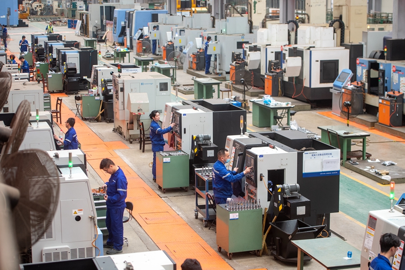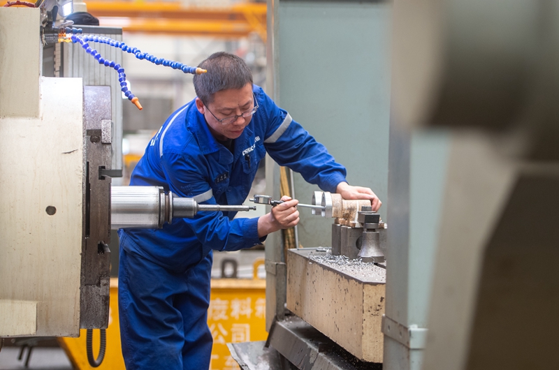 5月16日,在湖北省武汉市武昌造船生产车间,工作人员在测量工件的加工精度。 近年来,位于湖北省武汉市新洲区的武昌船舶重工集团有限公司围绕新型公务船、高端海工船、中小型绿色智能油化船和支线集装箱船等主建船型,积极推进数字化转型与智能制造,助力航运高质量发展。 新华社记者 杜子璇 摄