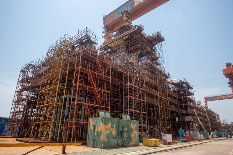 这是5月16日在湖北省武汉市武昌造船拍摄的正在进行总装建造的新船。 近年来,位于湖北省武汉市新洲区的武昌船舶重工集团有限公司围绕新型公务船、高端海工船、中小型绿色智能油化船和支线集装箱船等主建船型,积极推进数字化转型与智能制造,助力航运高质量发展。 新华社记者 杜子璇 摄 |
