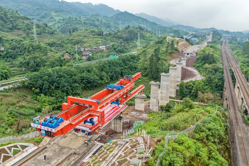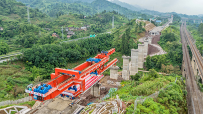7月10日,在西渝高铁陈家沟特大桥建设现场,架梁机在进行首孔箱梁架设作业(无人机照片)。 当日,中铁十四局工人将首孔长24.6米、重542吨的箱梁架设在西渝高铁重庆段陈家沟特大桥第一孔桥墩上,标志着西渝高铁重庆段箱梁架设施工正式启动。 西渝高铁是西安到重庆的高速铁路,全长739公里,设计时速350公里,是我国“八纵八横”高铁网京昆通道和包(银)海通道的重要组成部分。 新华社记者 唐奕 摄