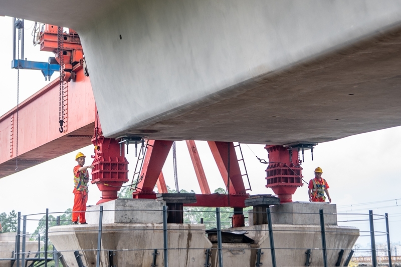 7月10日,在西渝高铁陈家沟特大桥建设现场,架梁机在工人的指挥下进行首孔箱梁架设作业。 当日,中铁十四局工人将首孔长24.6米、重542吨的箱梁架设在西渝高铁重庆段陈家沟特大桥第一孔桥墩上,标志着西渝高铁重庆段箱梁架设施工正式启动。 西渝高铁是西安到重庆的高速铁路,全长739公里,设计时速350公里,是我国“八纵八横”高铁网京昆通道和包(银)海通道的重要组成部分。 新华社记者 唐奕 摄
