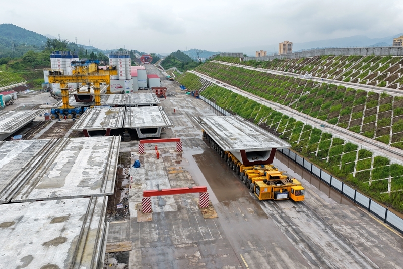 7月10日,在西渝高铁陈家沟特大桥附近的制梁场,运梁机在进行箱梁转运作业(无人机照片)。 当日,中铁十四局工人将首孔长24.6米、重542吨的箱梁架设在西渝高铁重庆段陈家沟特大桥第一孔桥墩上,标志着西渝高铁重庆段箱梁架设施工正式启动。 西渝高铁是西安到重庆的高速铁路,全长739公里,设计时速350公里,是我国“八纵八横”高铁网京昆通道和包(银)海通道的重要组成部分。 新华社记者 唐奕 摄