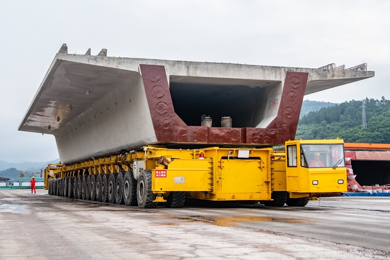 7月10日,在西渝高铁陈家沟特大桥附近的制梁场,运梁机在进行箱梁转运作业。 当日,中铁十四局工人将首孔长24.6米、重542吨的箱梁架设在西渝高铁重庆段陈家沟特大桥第一孔桥墩上,标志着西渝高铁重庆段箱梁架设施工正式启动。 西渝高铁是西安到重庆的高速铁路,全长739公里,设计时速350公里,是我国“八纵八横”高铁网京昆通道和包(银)海通道的重要组成部分。 新华社记者 唐奕 摄 |